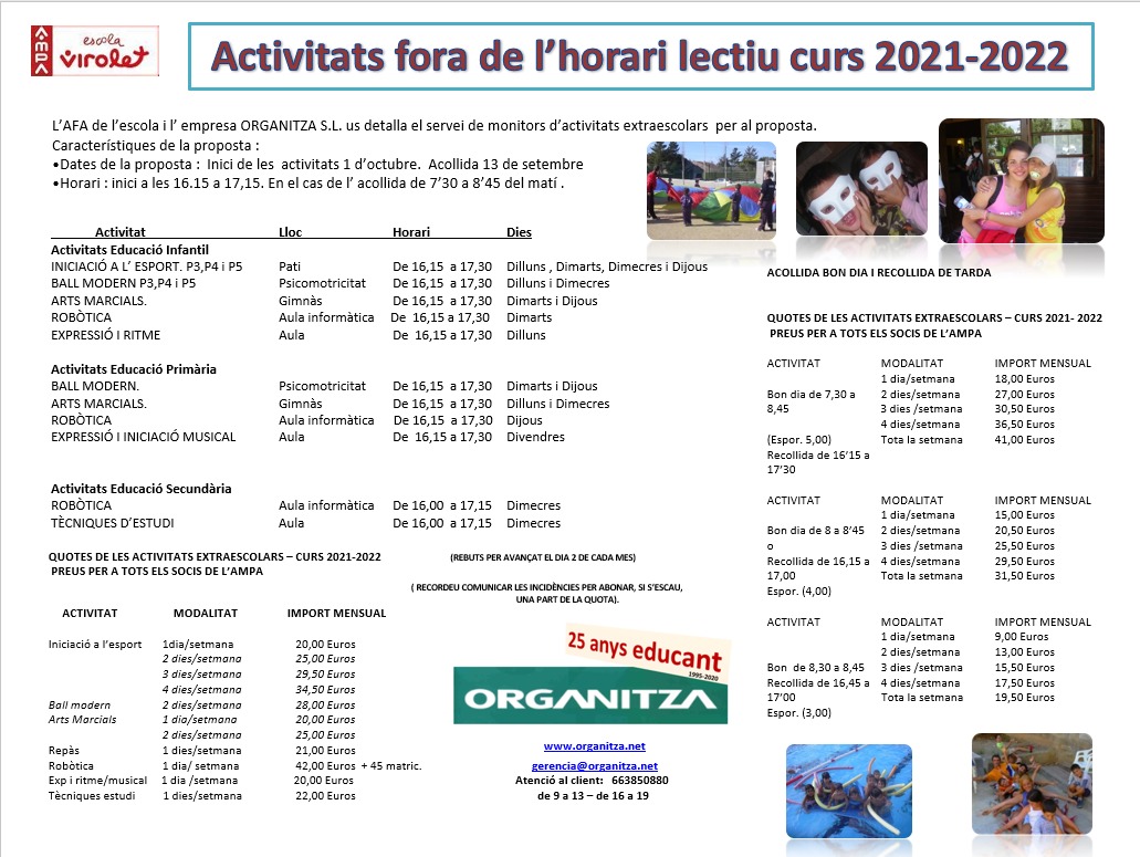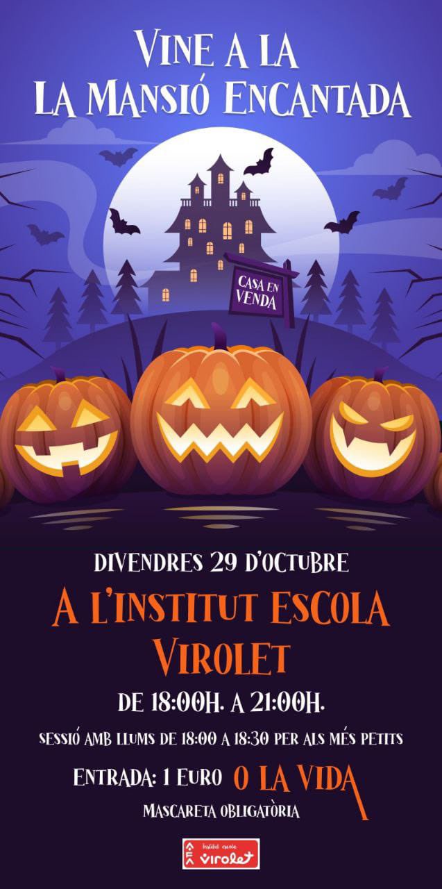 Ja queda menys per divendres…estas interessat en l’adquisició de l’esgarrifossa Mansió encantada?seràs capaç d’acabar la visita?T’esperem divendres 29,recorda, els + petits podran veure la Mansió amb les llums enceses de 18 a 18:30,a partit d’aquesta hora es farà la foscor… Activitats Extraescolars 2021-2022Nou Servei al TPV escolaJa es pot pagar amb Bizum al TPV escola.