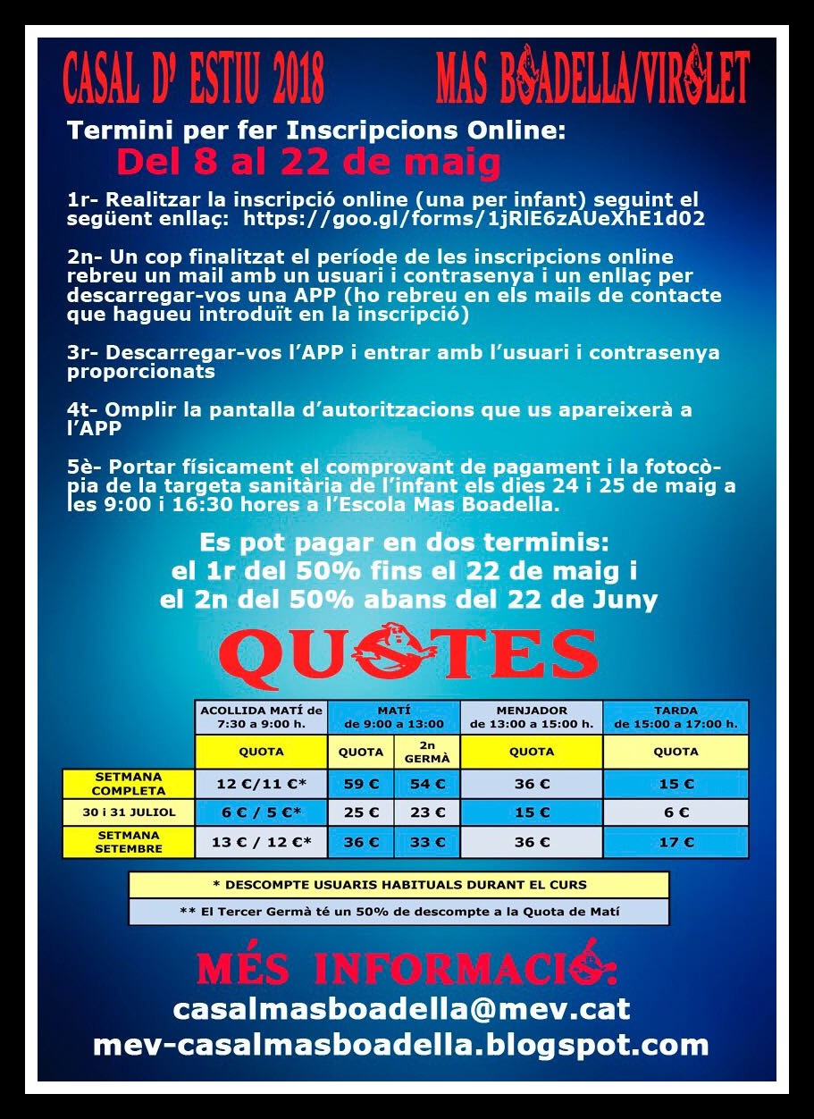 Les inscripcions les podreu realitzar del 6 al 9 de juny seguint les instruccions que trobareu en el document adjunt. Aquest estiu tot serà una mica diferent tenint en compte les circumstàncies que estem vivint actualment. Tot i així, des del MEV garantim complir amb totes les normatives aprovades pel PROCICAT per tal de garantir les condicions higièniques i sanitàries necessàries perquè el casal sigui el més segur possible.